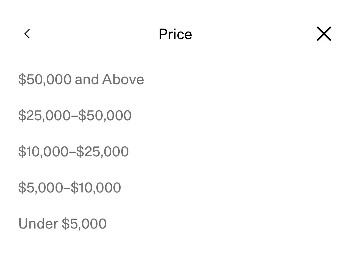 Artsy’s current website lacked an adequate price filtering option for those on a budget of less than $5,000 and didn’t currently allow users to sort results by price either. We realized how important these things were from our user interviews with the younger demographic being deterred when the numbers aren’t immediately and easily available throughout the whole experience. That is further reinforced with a shopping cart to keep everything all in one place which Artsy.net was also missing compared to competitors.