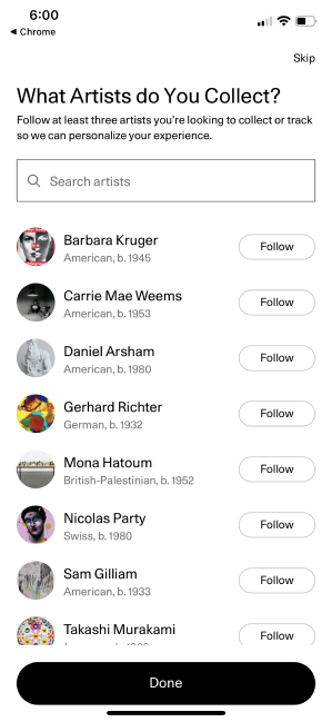 My team collectively asked around for any art enthusiasts within our own personal and professional networks in order to compile two groups for user interviews and initial usability testing. Focusing on those who were already familiar with Artsy, we tried to include all creative perspectives to gain a variety of insights.