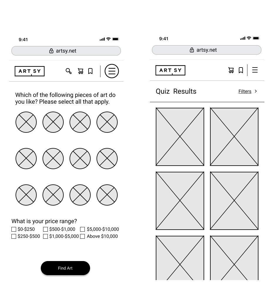 The 5 participants for the usability testing were asked to perform a series of tasks on the existing Artsy.net mobile site. We recorded their screens and their reactions via Zoom to add to our data set. This first-hand observation was vital to gaining a well-rounded concept of our users and their experiences with Artsy as is. Our findings were all recorded using qualitative data like verbal in-test feedback and a quantitative satisfaction survey post-test.